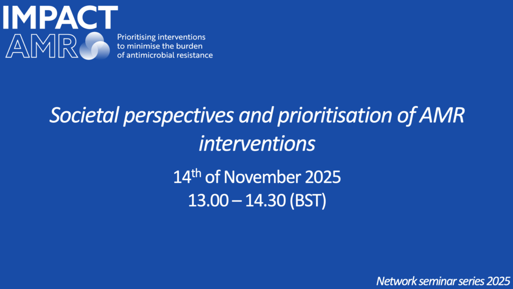 The IMPACT AMR Network takes a transdisciplinary approach to improving the use of evidence to inform prioritisation of efforts to impact antimicrobial resistance. In Autumn 2025, we are running a series of thematic seminars, inviting two to three keynote speakers for each event to present their work and to engage with participants to discuss findings, approaches and ways forward.